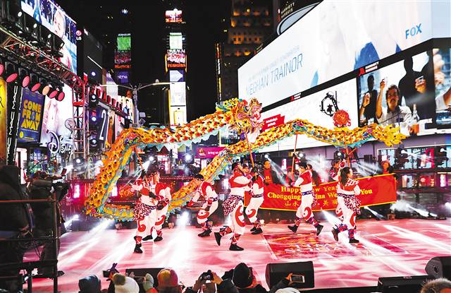 紧接着,来自重庆铜梁龙舞表演队的艺术家们登台,近6分钟的时间里,七男一女通力合作,动作行云流水,霎时,一条金色、红色和蓝色相间,长15米的铜梁龙,迅猛、矫健地飞跃在纽约时报广场,熠熠生辉。